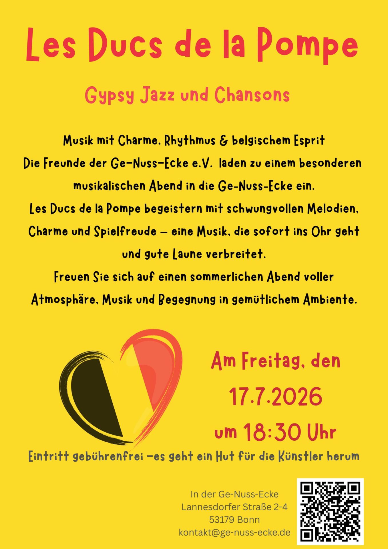 Les Ducs de la Pompe, Band (Jazz) aus Bonn - Backstage PRO Musik mit Charme, Rhythmus & belgischem Esprit Die Freunde der Ge-Nuss-Ecke e.V. laden zu einem besonderen musikalischen Abend in die Ge‑Nuss‑Ecke ein. Les Ducs de la Pompe begeistern mit schwungvollen Melodien, Charme und Spielfreude – eine Musik, die sofort ins Ohr geht […]